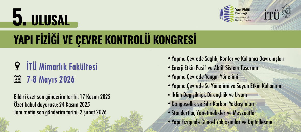 Bu kapsamda, Yapı Fiziği Derneği tarafından düzenlenen ve İstanbul Teknik Üniversitesi Mimarlık Fakültesi ev sahipliğinde 7–8 Mayıs 2025 tarihlerinde gerçekleştirilecek 5. Ulusal Yapı Fiziği ve Çevre Kontrolü Kongresi, yapı fiziği ve çevre kontrolü alanında güncel araştırmaları ve yenilikçi yaklaşımları bir araya getirmeyi amaçlamaktadır.